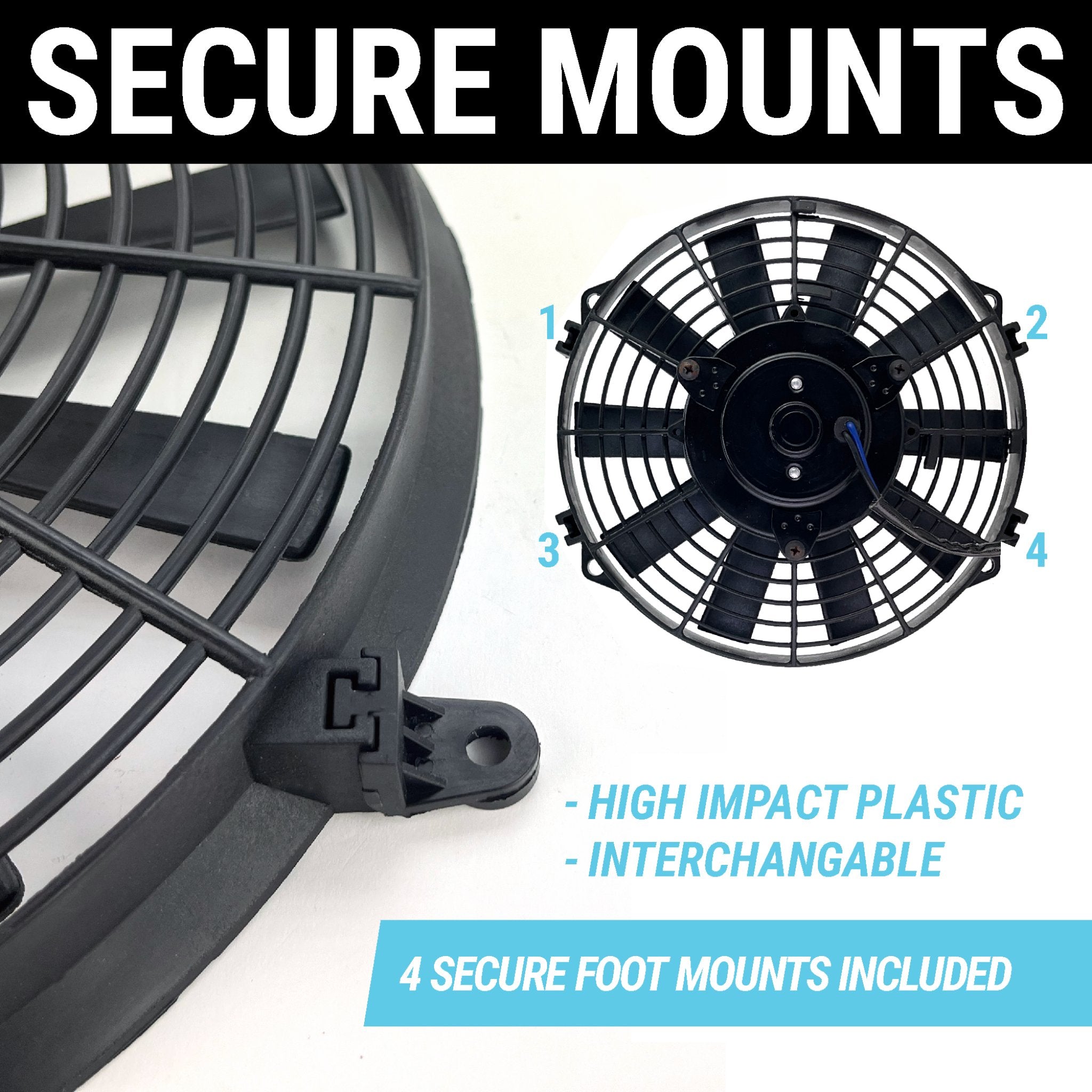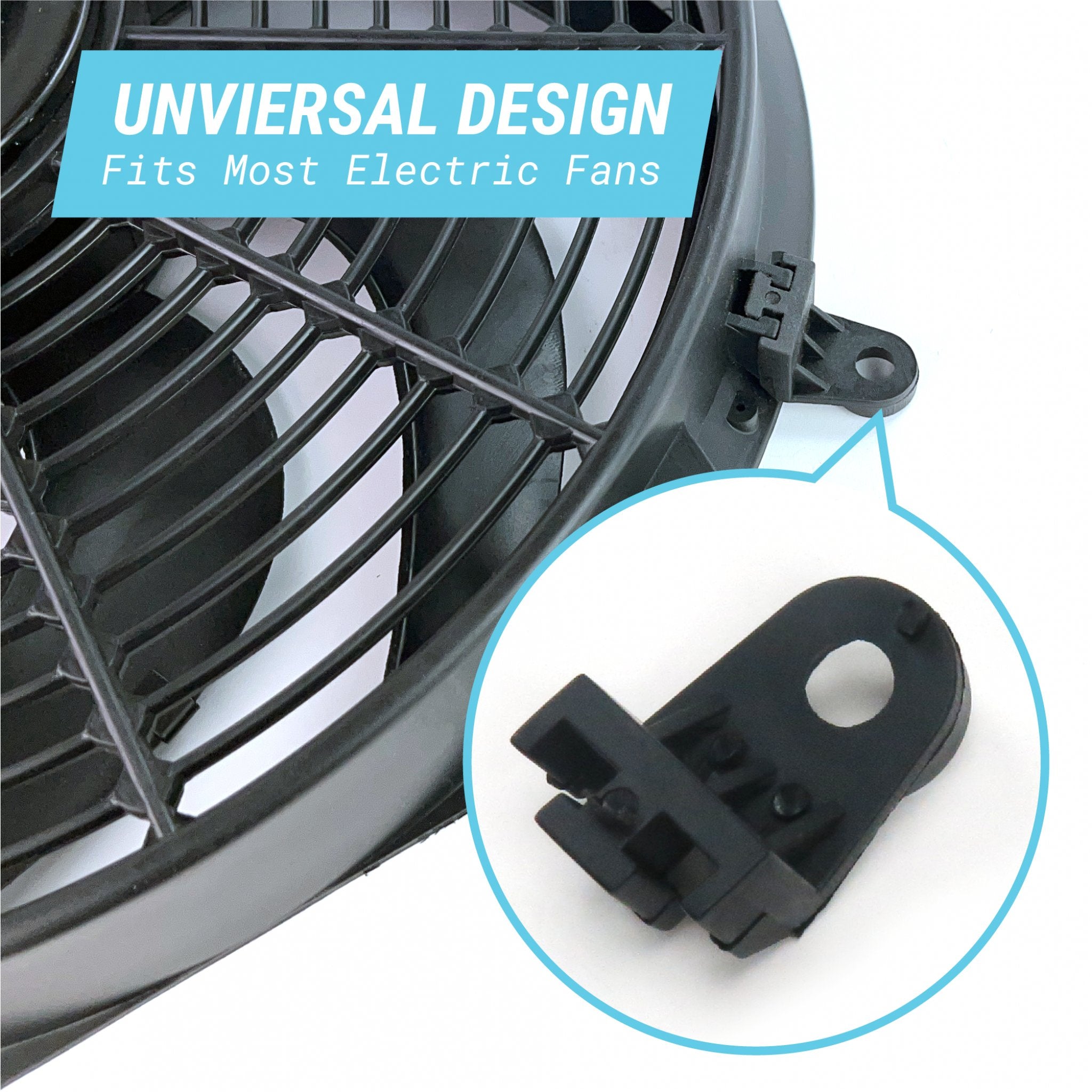 Zirgo's® heavy duty interchangeable fan mounts make it easy to mount your fan on any angle! These high strength automotive cooling fan mounting tabs are made of a heat resistant high impact plastic for long lasting durability.